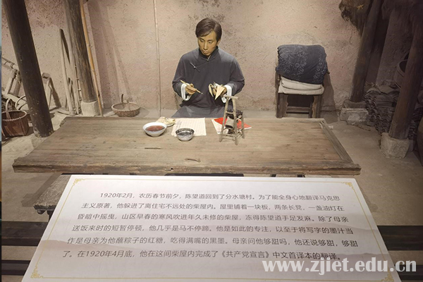 在陈望道故居,全体党员跟随讲解员的介绍,通过一段段文字、一张张图片、一件件实物,回顾了陈望道同志的生平事迹。陈望道将墨水误当红糖水,蘸着墨汁,吃下母亲送来的粽子,这个“真理的味道非常甜”的故事,让在场的所有党员都真切的感受到了信仰的力量。